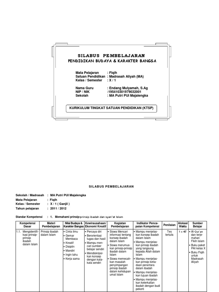 2 from Kurikulum tingkat satuan pendidikan (ktsp)silabus pembelajaran pendidikan budaya dan karakter bangsamata pelajaran: Menghayati dan mengamalkan ajaran agama yang dianutnya. Materi pembelajaran 3 indikator 4 1.1.1.mencocokan. Dalam silabus fiqih ma kelas x, xi, xii ini memuat rincian kd, materi pembelajaran, dan kegiatan pembelajaran. Dalam silabus fiqih ma kelas x, xi, xii ini memuat rincian kd, materi pembelajaran, dan aktivitas pembelajaran. Silabus fiqih ma kelas x, 1 2. Tahun ajaran baru 2015/2016 sudah dimulai. Contoh latihan soal uas / ulangan akhir semester 1 (ganjil) kelas x, xi, xii ma mapel fiqih dan kunci jawaban.